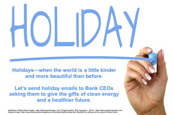 Official Title: Gather Up! We’re Sending Holiday Cards to Dirty Bank CEOs (sharing an email we received...) Throughout Third Act’s first year, you’ve heard how the big four banks—Bank of America, Chase, Citibank, and Wells Fargo—are bankrolling the climate crisis. After the banks’ infuriatingly disappointing participation in the Egypt Climate Conference, where they worked to... Continue Reading →